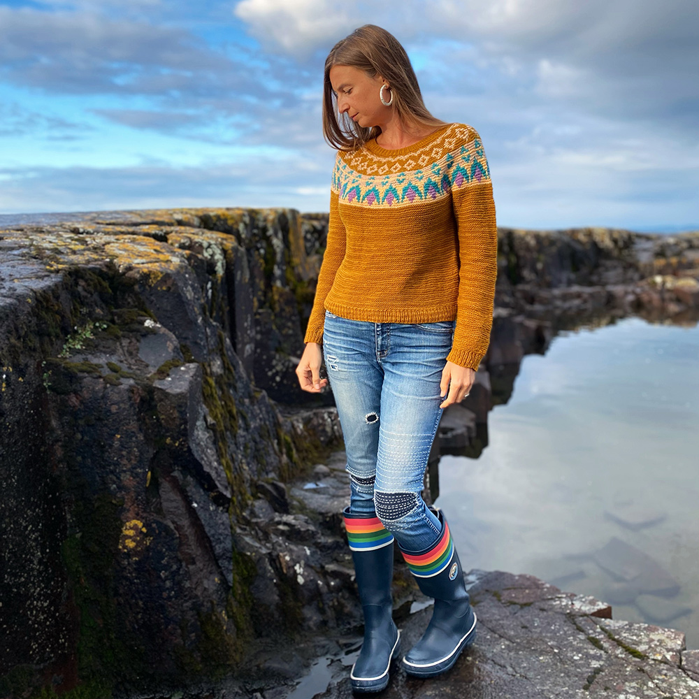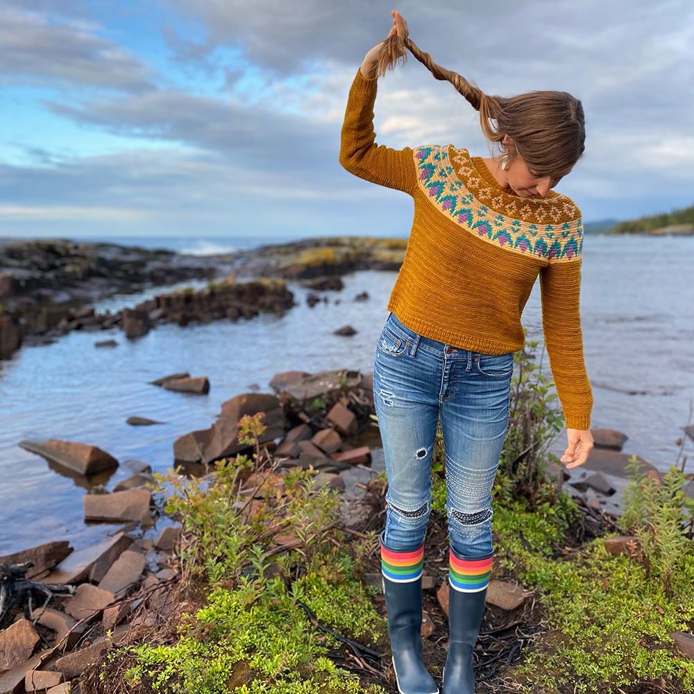 This sweater was inspired by a podcast that I binge-listened to last June with my family called “Dolly Parton’s America” and my love for working with Soka’pii yarn from The Farmer’s Daughter Fibers in Montana.