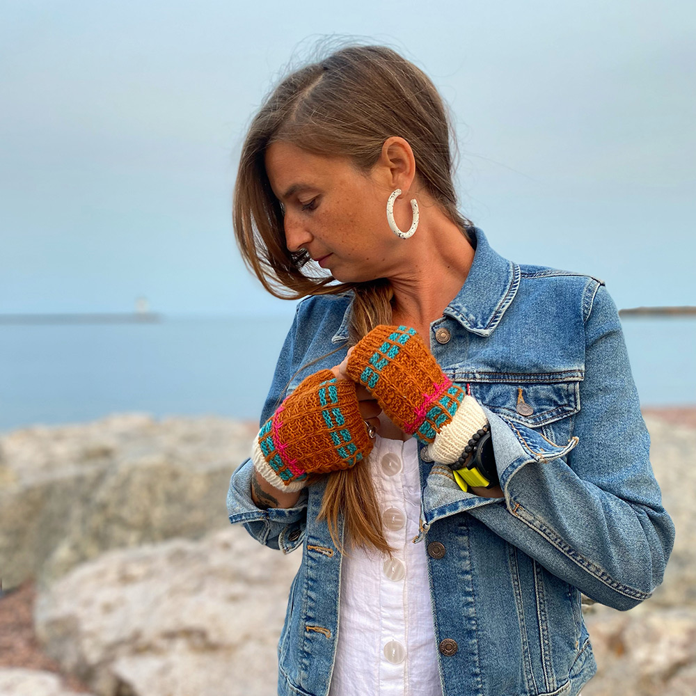 Something playful to tuck into your knitting bag during the light knitting season. I squeezed as much color contrast as I could into this little accessory. One tester made two different mitts. That way, she said, she’ d always know which one was for the right hand and which one was for the left!